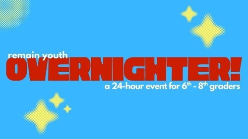 Remain Youth Group is hosting a 24-hour event for all 6th-8th graders! The goal of this event is for students to deepen their relationships with God and to have fun while connecting with other students. This event includes inflatables, laser tag, sermons from the Bible, worship, a trip to the trampoline park, lots of games, and more!